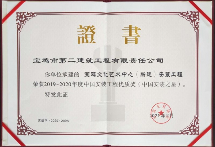 4月22日,中國安裝協(xié)會第七屆二次理事(擴(kuò)大)會議暨工程創(chuàng)優(yōu)經(jīng)驗交流會在濟(jì)南召開。會議對2019-2020年度中國安裝工程優(yōu)質(zhì)獎(中國安裝之星)獲獎企業(yè)及個人進(jìn)行了表彰,由寶雞二建承建的寶雞文化藝術(shù)中心項目安裝工程獲此殊榮。