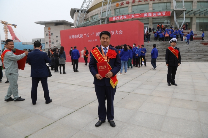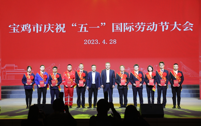 4月28日,在寶雞市慶祝“五一”國(guó)際勞動(dòng)節(jié)大會(huì)上,集團(tuán)公司李紅軍同志被寶雞總工會(huì)授予五一勞動(dòng)獎(jiǎng)?wù)拢⑸吓_(tái)領(lǐng)獎(jiǎng)。(左三)