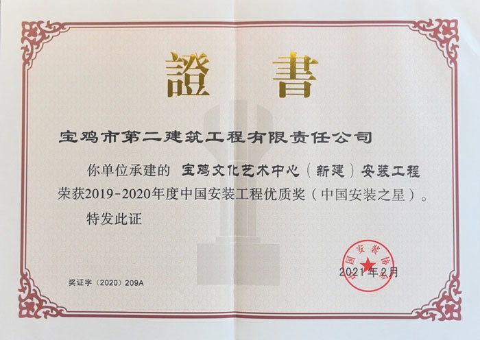 ?2019~2020年度中國(guó)安裝工程優(yōu)質(zhì)獎(jiǎng)(寶雞文化藝術(shù)中心(新建)安裝工程)